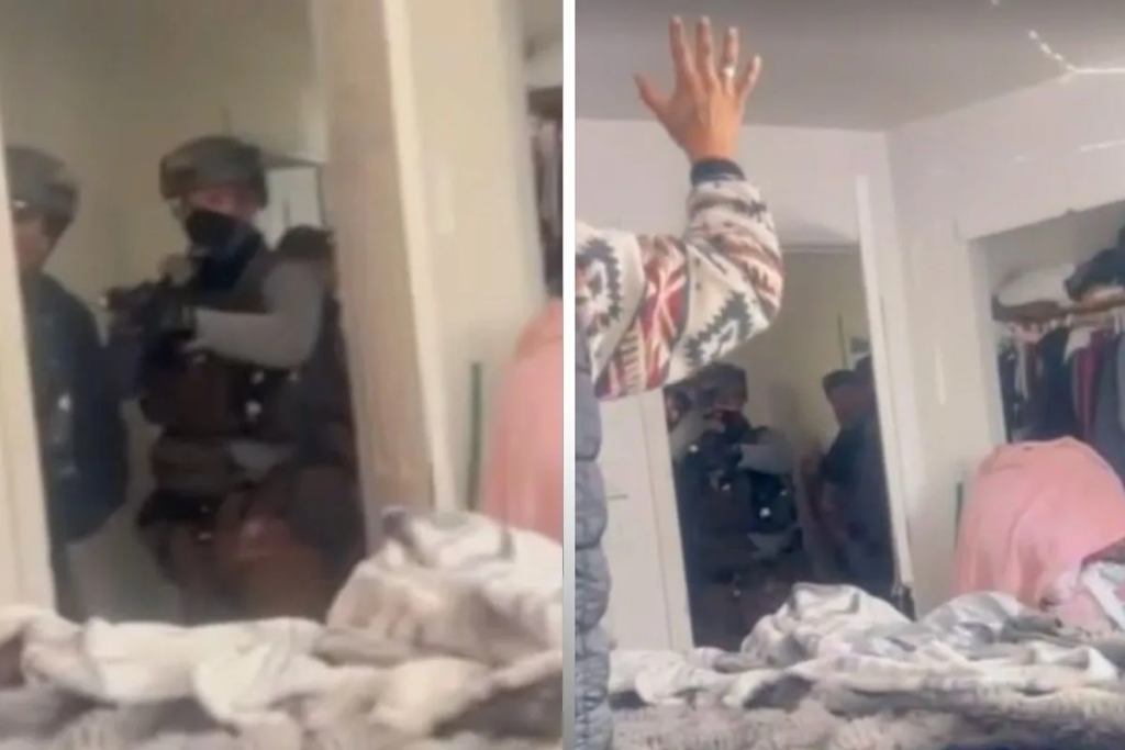 The short clip, now circulating widely on X (formerly Twitter) and Facebook, opens with ICE officers pounding on the door before forcing their way inside. As they enter the bedroom, a woman can be heard screaming, clutching her infant, while agents shout, “Police! Don’t move, hands up!”