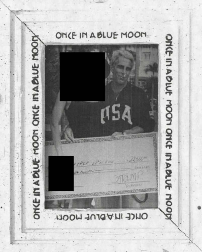 The photo shows Epstein standing beside a woman whose face is fully blacked out. The two are holding an oversized novelty check for $22,500, bearing what appears to be Trump’s signature. The framed image includes the phrase “Once in a blue moon.”