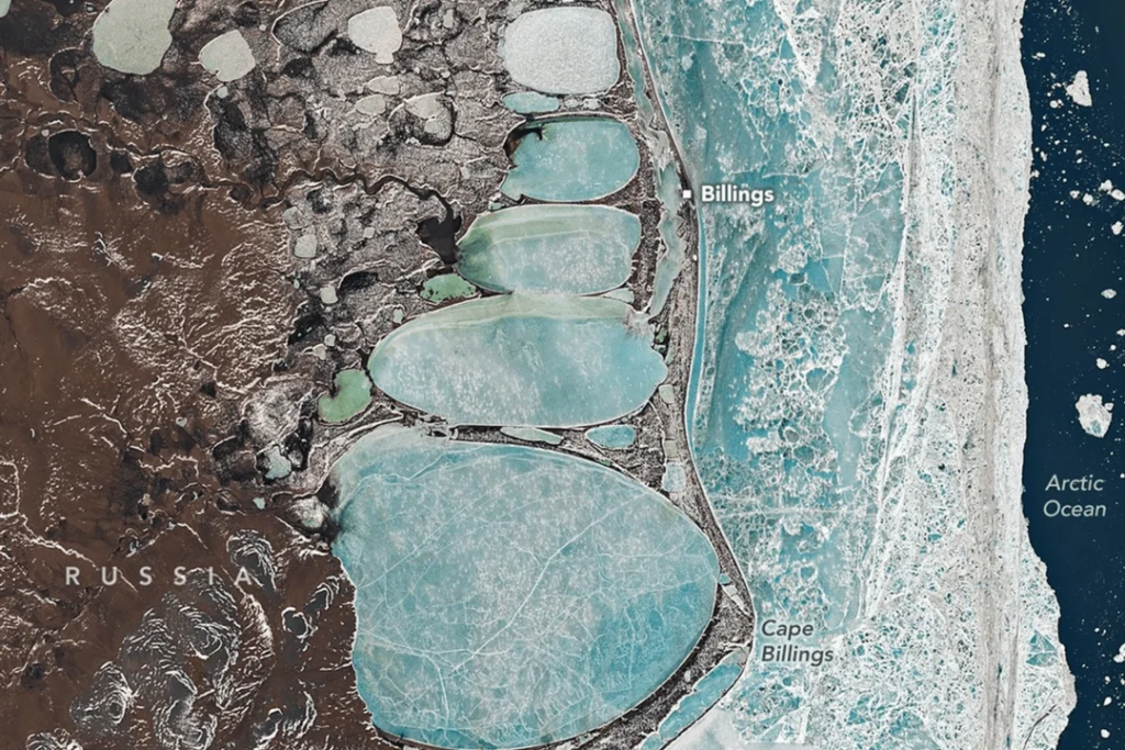 In reality, the scene spans about 22 kilometers and consists of five frozen lagoon basins aligned in sequence near Billings and Cape Billings along the East Siberian Sea coast. Their size, spacing, and oval forms happen to line up in a way that tricks the human eye.