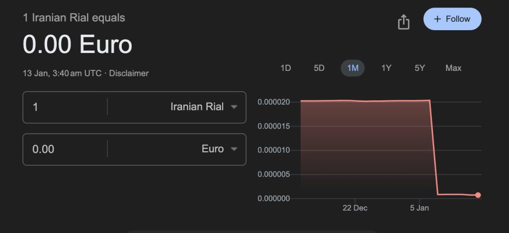 Google’s currency converter showing the Iranian rial as “0.00 per euro” reflects the currency’s extreme devaluation amid a worsening economic crisis and nationwide protests that have morphed into broad political unrest. The display is a rounding effect caused by the rial’s collapse and is intertwined with deepening public anger over inflation and governance in Iran.