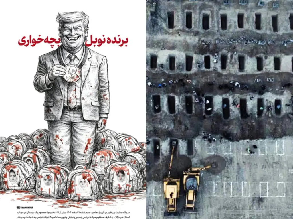 • The image references a deadly missile strike on a girls’ school in Minab, Iran.