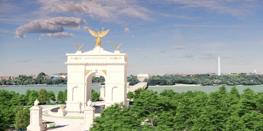 Set to rise at Memorial Circle, at the western end of the Arlington Memorial Bridge, the structure would sit across the Potomac River from the Lincoln Memorial—placing it in one of the most symbolically charged landscapes in the United States.