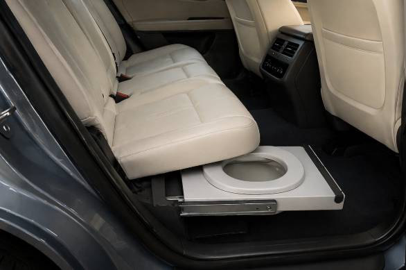 The toilet unit remains hidden beneath the passenger seat during normal use. When activated, it rises into position, allowing the occupant to use it without leaving the seat.