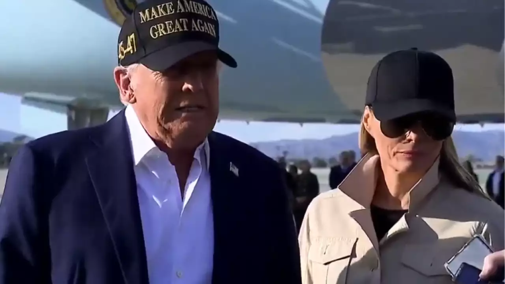 The Trumps then traveled to Los Angeles, where wildfires had ravaged communities and left hundreds displaced. Upon their arrival at LAX, California Governor Gavin Newsom greeted the President and First Lady warmly, marking a rare moment of bipartisan cooperation.