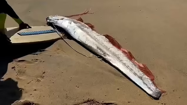 An oarfish, often referred to as a ‘doomsday fish,’ was discovered earlier this month on Playa El Quemado beach in Baja California Sur, Mexico. The sighting, which took place on February 9, was captured on video and has since gone viral on social media.