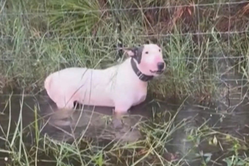 Trooper, a white bull terrier, was discovered tied to a fence and left to die as floodwaters rose near Interstate 75 in Tampa, Florida. This heart-wrenching scene unfolded just before Hurricane Milton, a Category 3 storm, made landfall in October. The Florida Highway Patrol came to Trooper’s aid, rescuing him from the dire situation and bringing him to safety.