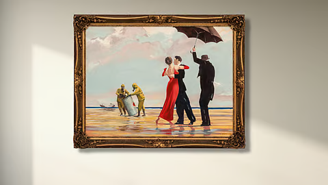 Banksy’s version, sometimes referred to as “Toxic Beach,” disrupts the romantic scene by adding a sinking oil liner and hazmat-suited workers wheeling toxic waste onto the shore.
