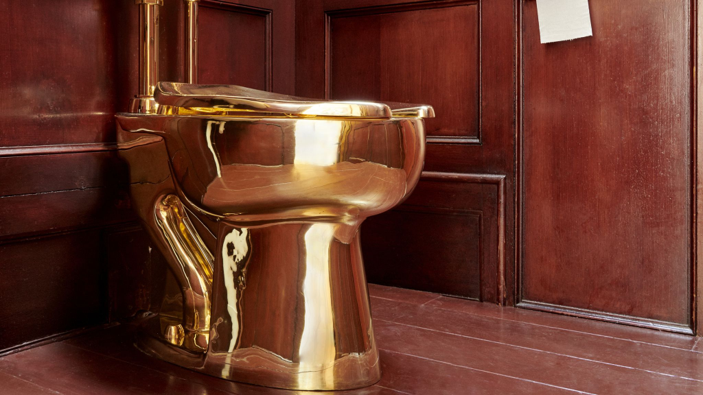 The theft of America captured international headlines in 2019. The artwork, which weighed 98 kilograms (216 pounds) and was insured for $6 million, had been installed at Blenheim Palace as part of a contemporary art exhibition. The golden toilet had previously been displayed at New York’s Guggenheim Museum.
