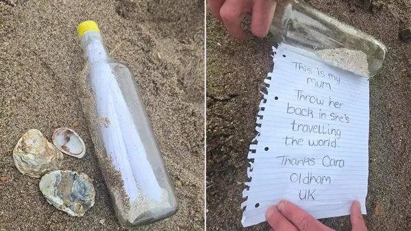 The bottle contained a handwritten note that read: “This is my mum. Throw her back in, she’s travelling the world.” Inside were the ashes of Wendy Chadwick, who passed away at the age of 51.