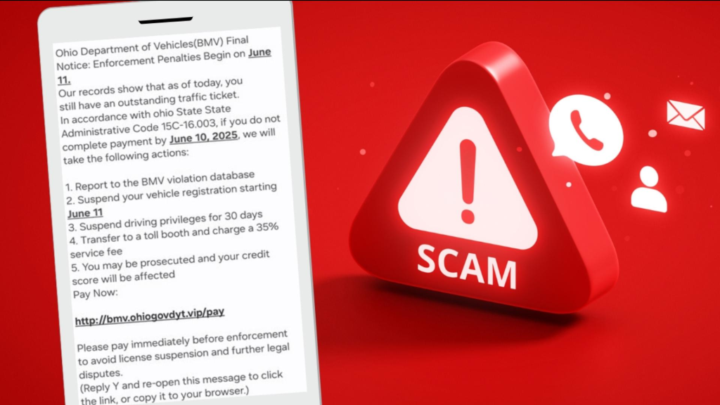 Ohio residents are being cautioned about a new scam involving fraudulent text messages that claim recipients owe unpaid traffic tickets. These messages, which falsely appear to be from the Ohio Bureau of Motor Vehicles (BMV), warn of license suspension, registration holds, and even legal action unless immediate payment is made.