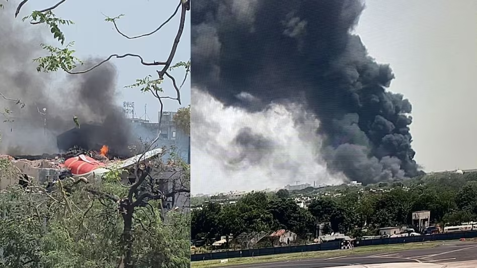 Ahmedabad, India — June 12: A devastating air crash shook the Sardar Vallabhbhai Patel International Airport this morning as an Air India Boeing 787-8 Dreamliner, en route to London, crashed moments after takeoff. The wide-bodied jet was carrying 242 people and was fully fueled for the long-haul journey to the UK.